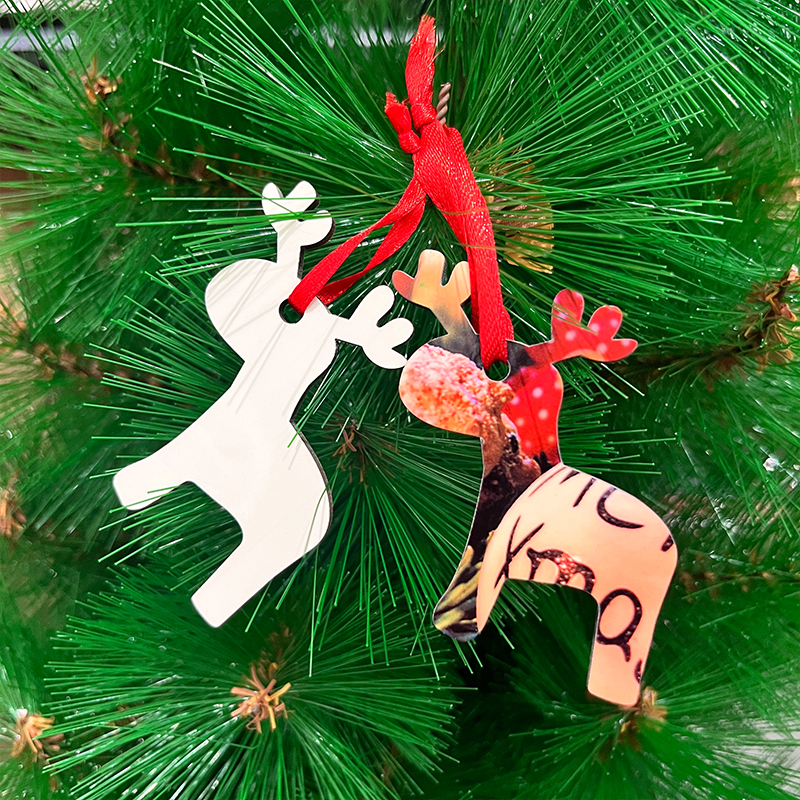 Leadsub’s deer shape sublimation blank MDF ornament, size 6.5×5.4cm, thickness of 3mm, with hanging red ribbon. Customable in size, thickness, pattern, both sides have been coated with premium sublimation coating, with a protective film on the surface, you can transfer your design to the ornament using a heat press or 3D vacuum machine.