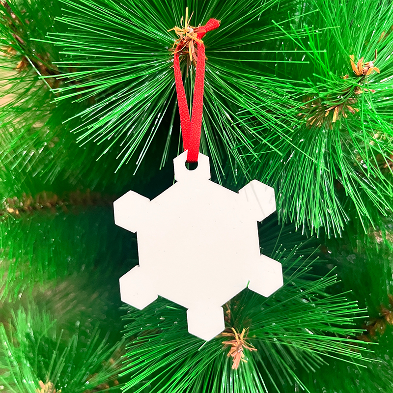 Leadsub’s snow shape sublimation blank MDF ornament, size 6x5cm, thickness of 3mm, with hanging red ribbon. Customable in size, thickness, pattern, both sides have been coated with premium sublimation coating, with a protective film on the surface, you can transfer your design to the ornament using a heat press or 3D vacuum machine.